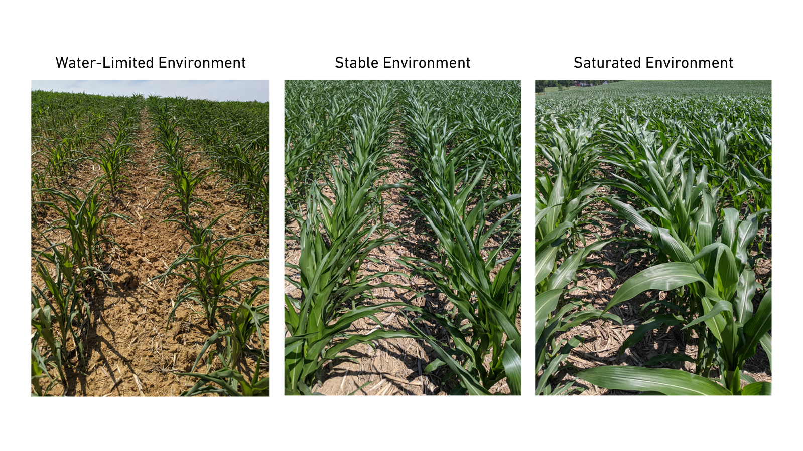 By the time corn reaches V3 to V6, you can already start to see differences across a field. Some plants are taller, darker green and closing canopy faster (saturated environments), while others are clearly lagging behind (water-limited environments).